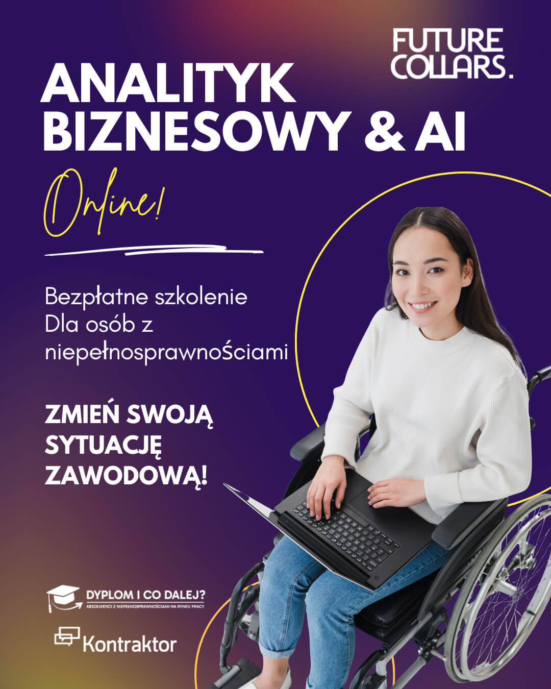 Ponad 3,5 tysiąca zł stypendium stażowego oraz darmowy kurs online łączący analizę biznesową z AI — to oferta przygotowana przez Future Collars i Kontraktor Sp. z o.o. dla osób z niepełnosprawnościami. W projekcie „Dyplom i co dalej? Absolwenci z niepełnosprawnościami na rynku pracy”, współfinansowanym ze środków PFRON, uczestnicy mogą zdobyć kompetencje przyszłości i rozpocząć płatny, czteromiesięczny staż w nowoczesnych firmach technologicznych.