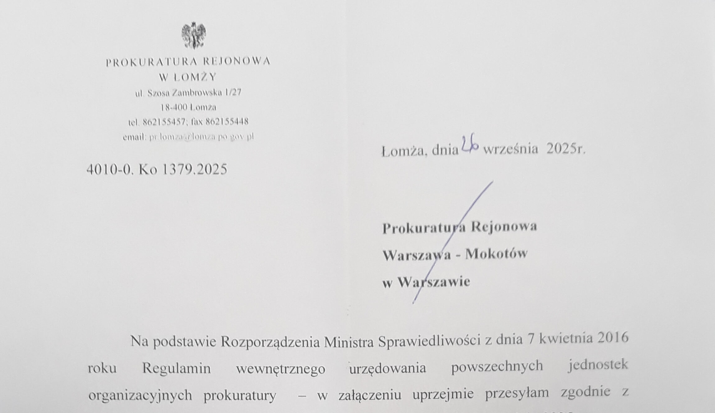 Łomżyńska rejonówka przesłała do Prokuratury Warszawa - Mokotów zawiadomienie w sprawie podejrzenia niedopełnienia obowiązków przez pracowników NFOŚiGW.