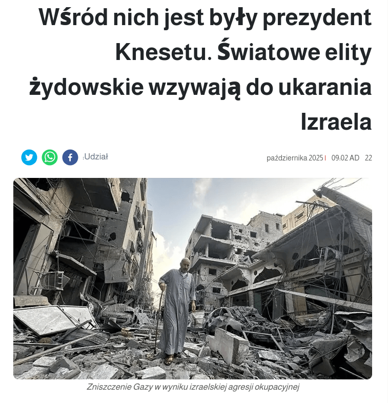 Działając w interesie publicznym ujawniamy informacje o inicjatywie światowych żydów w sprawie zbrodni i ludobójstwa dokonywanego na Palestyńczykach. Operująca w Polsce propaganda cenzuruje wiadomości nt. zbrodniczej działalności władz Izraela i jednocześnie rozpowszechnia kłamliwą narrację jakoby to głównie żydzi byli ofiarami rozpętanej wojny.