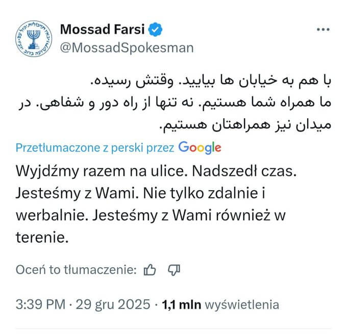 O rzeczywistych inicjatorach jest za to głośno w mediach społecznościowych. Przykładowo: Nowe Ateny w serwisie X: „Iran wezwał ambasadorów Wielkiej Brytanii, Niemiec, Włoch i Francji do obejrzenia nagrań Mossadu strzelającego do Irańczyków, jak w 2014 do Ukraińców ("Delta" i inni). Szef MSZ Iranu podkreślił, że te działania są uważane za zorganizowany sabotaż. https://x.com/NoweAteny/status/2010747672219529250