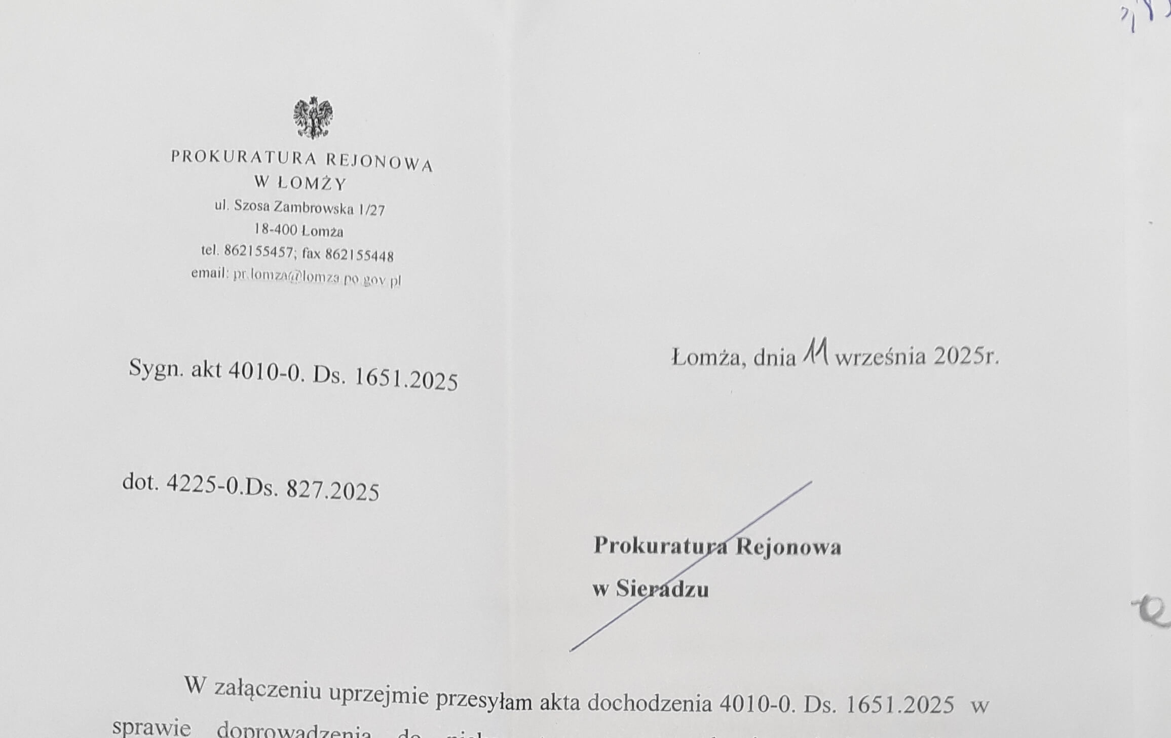 Prokuratura Rejonowa w Łomży poinformowała o przekazaniu akt postępowania do Prokuratury Rejonowej w Sieradzu.