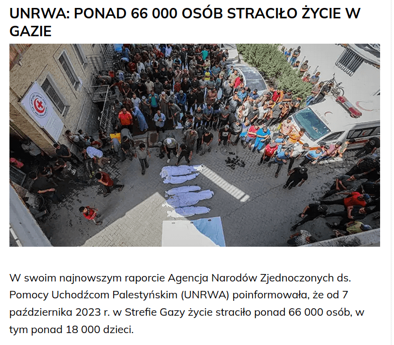 Agencja Narodów Zjednoczonych ds. Pomocy Uchodźcom Palestyńskim (UNRWA) poinformowała, że od 7 października 2023 r. w Strefie Gazy życie straciło ponad 66 000 osób, w tym ponad 18 000 dzieci.